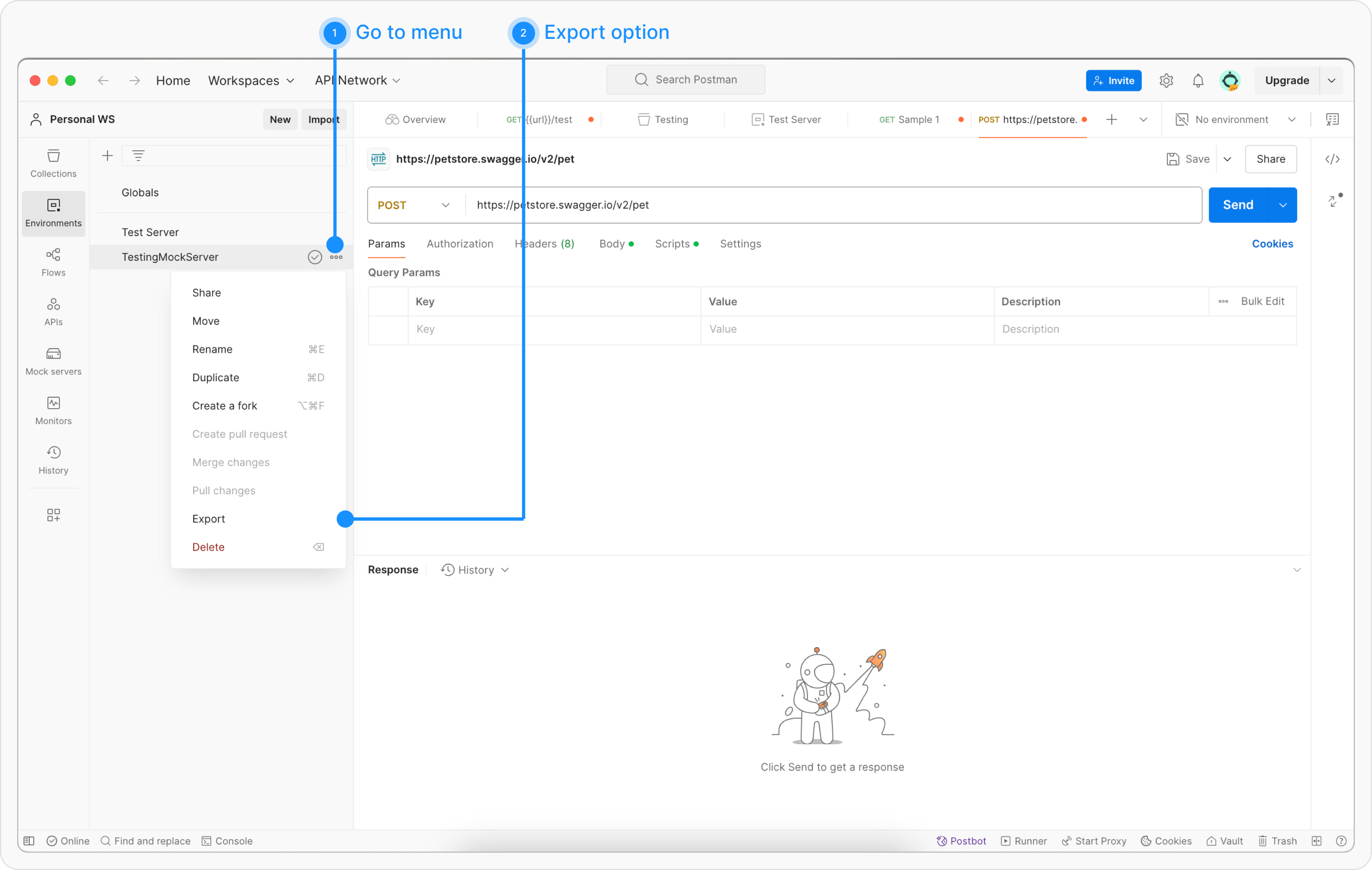 Step 1: Open Postman and go to the Environments tab in the left sidebar to view your environments. Step 2: Click the ellipsis (...) next to the environment you wish to export and select Export. Step 3: Choose a location to save the exported environment file and click Save. Step 4: Import using the same steps as explained in Import into Requestly section above.