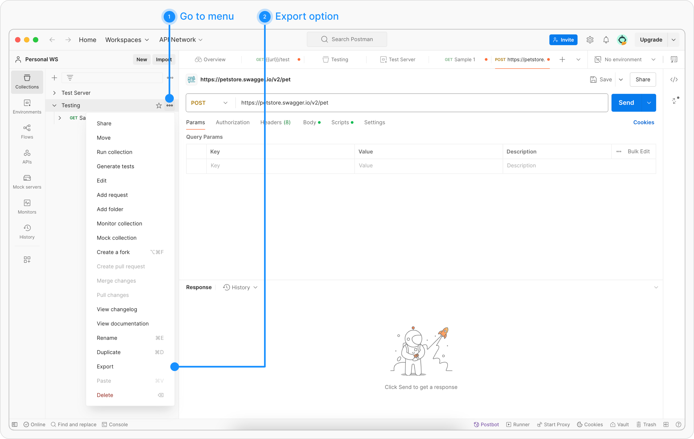 You can also export individual collections and environments from Postman, as explained at the end of this documentation.