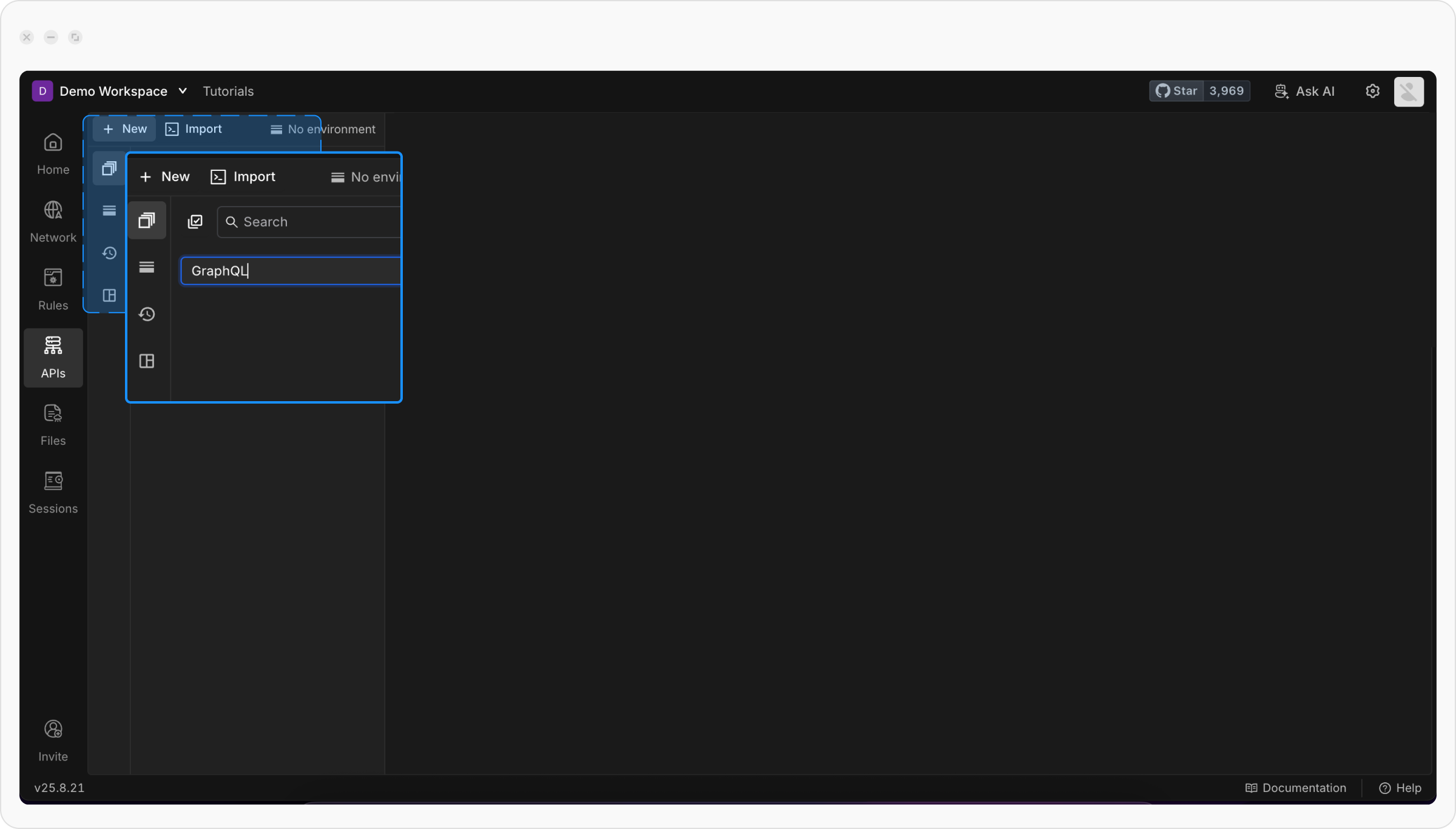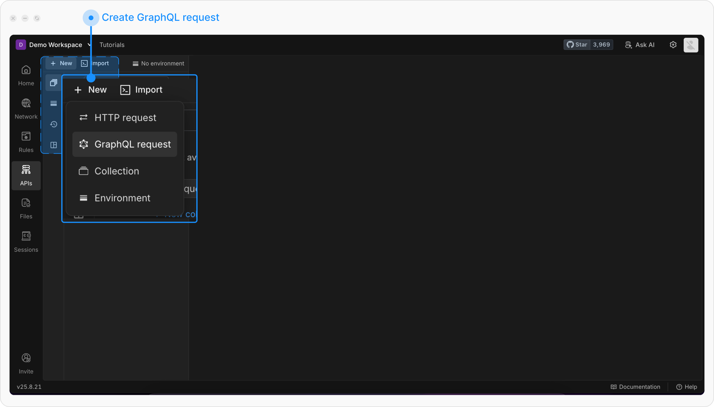 Click the API Client link in the left sidebar of the Requestly application, then click the + New button to create a new request and select GraphQL request from the menu.