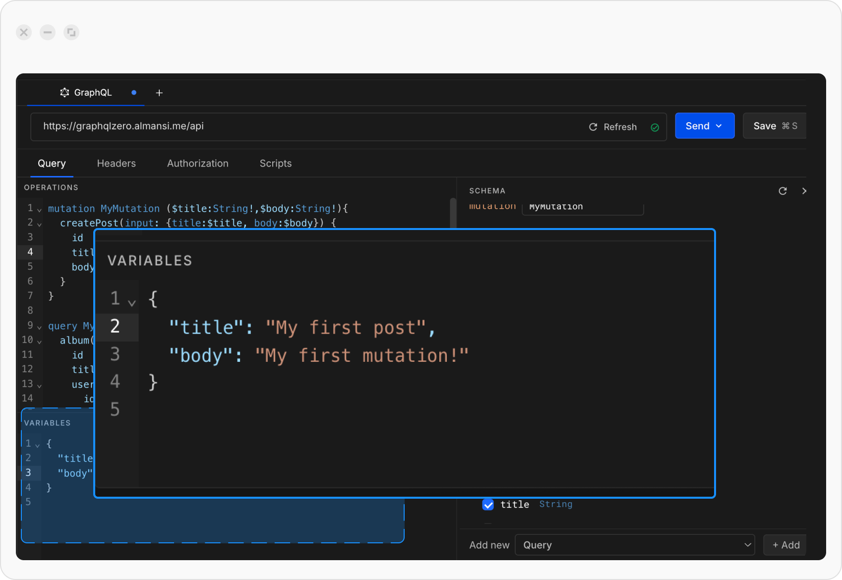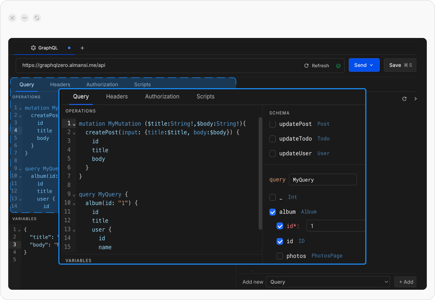 From the schema explorer, select more than one field. Both queries will appear in the Query editor. Alternatively, you can manually new query / mutation