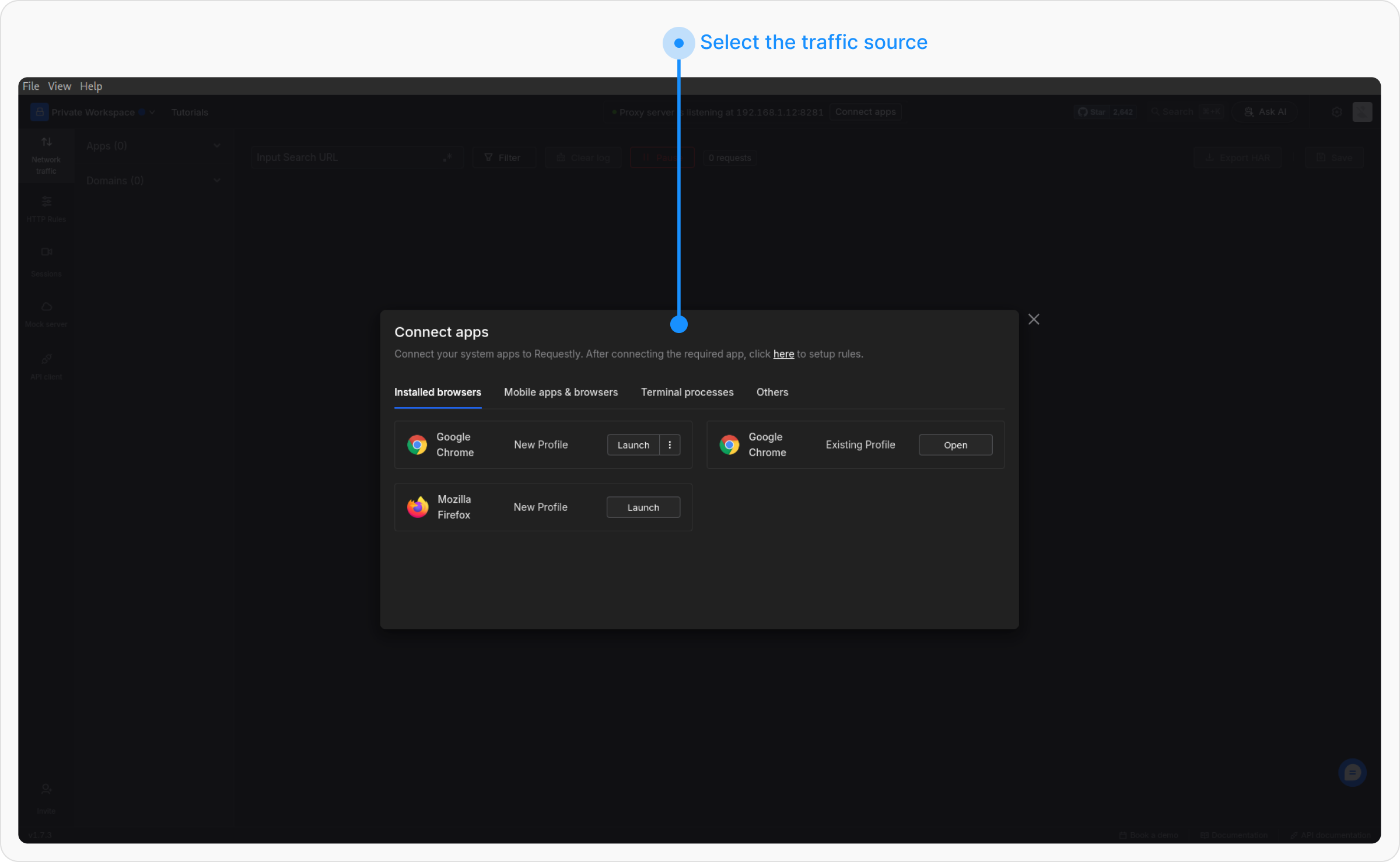 Connect Apps buttons to open the Connect Panel, which displays all supported apps Requestly can connect to.