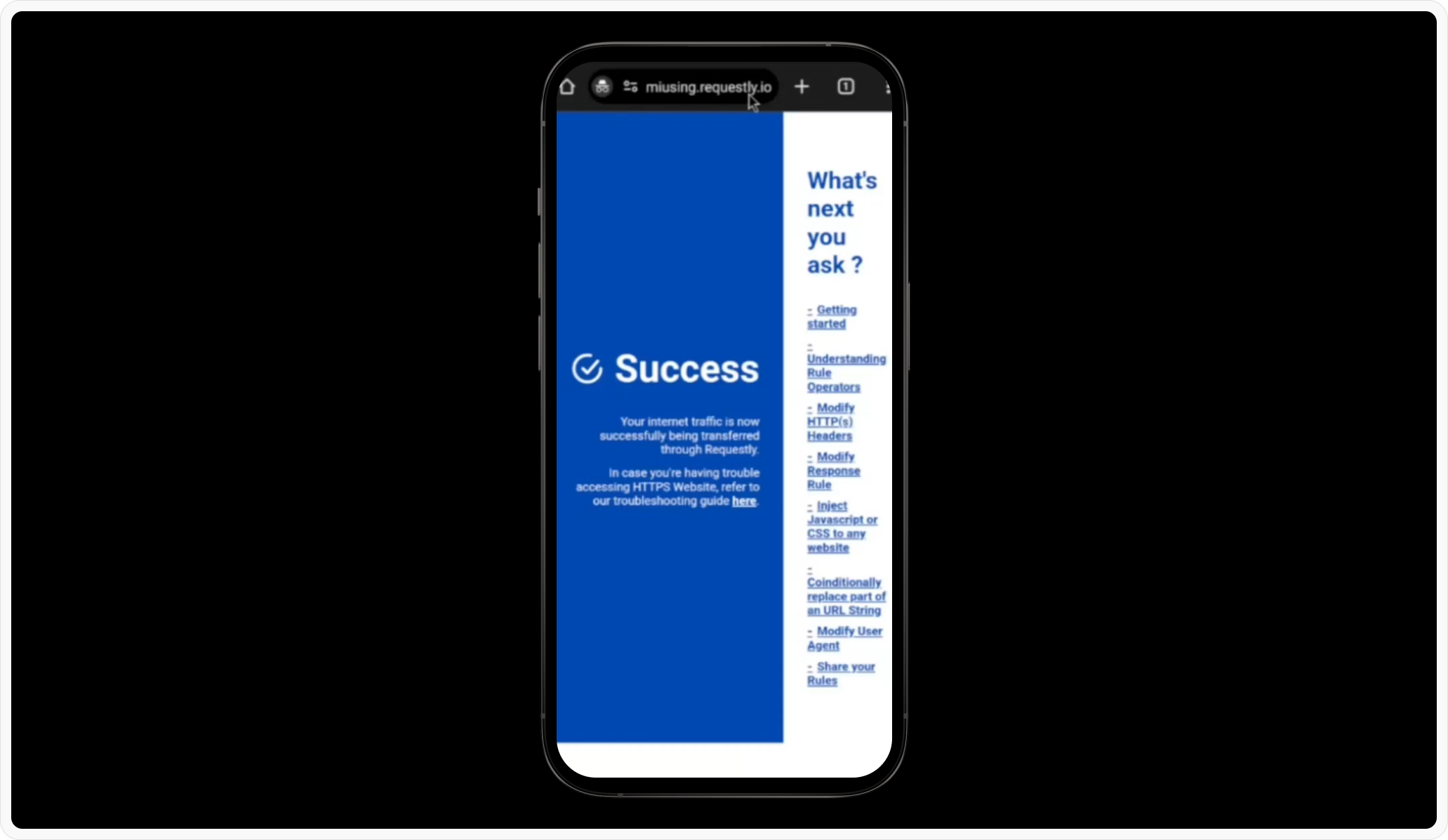 Once connected, a success message will appear. You can now visit amiusing.requestly.io to verify your connection.