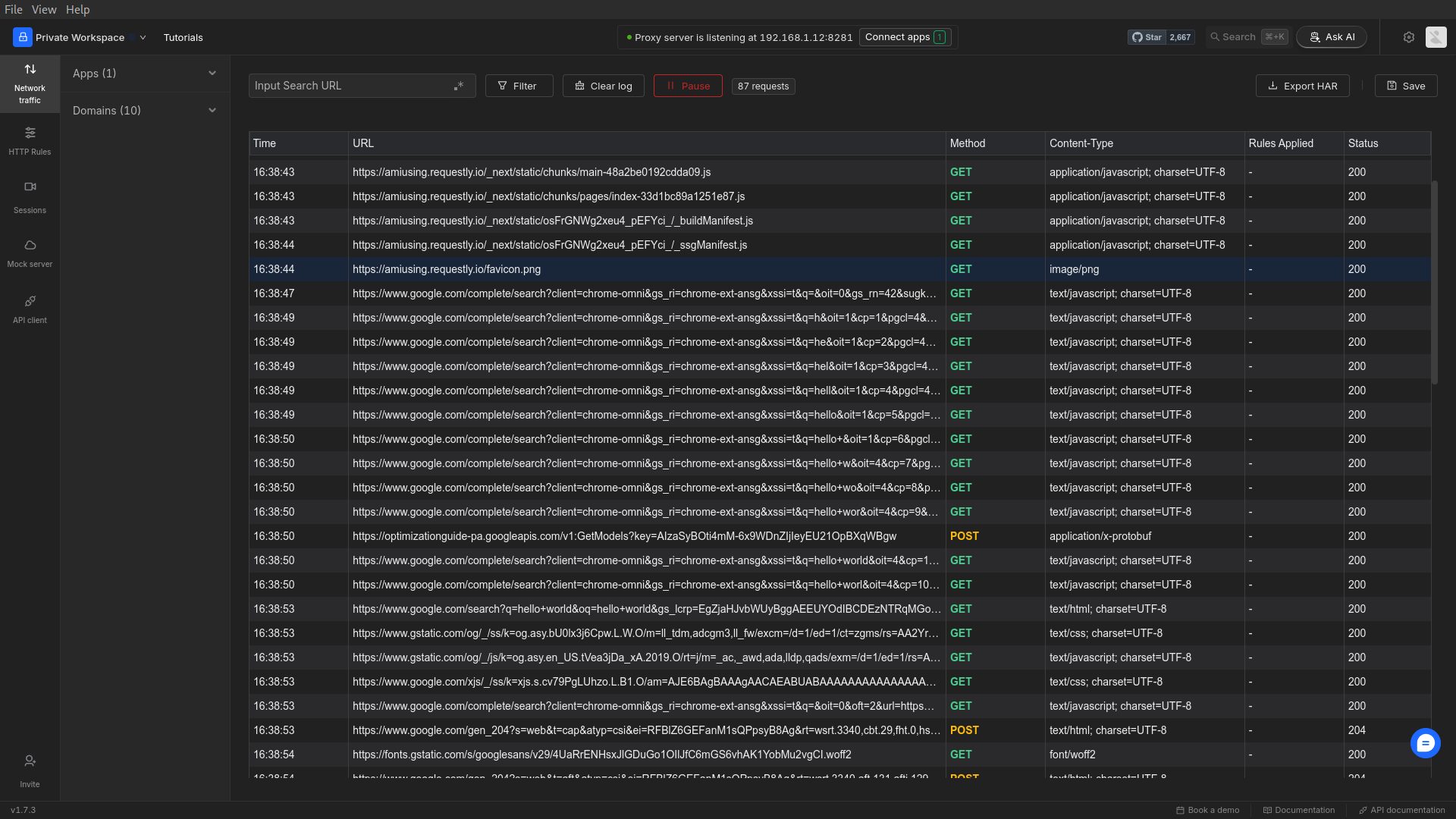 Return to the Requestly dashboard to review all captured network traffic in the Network table.