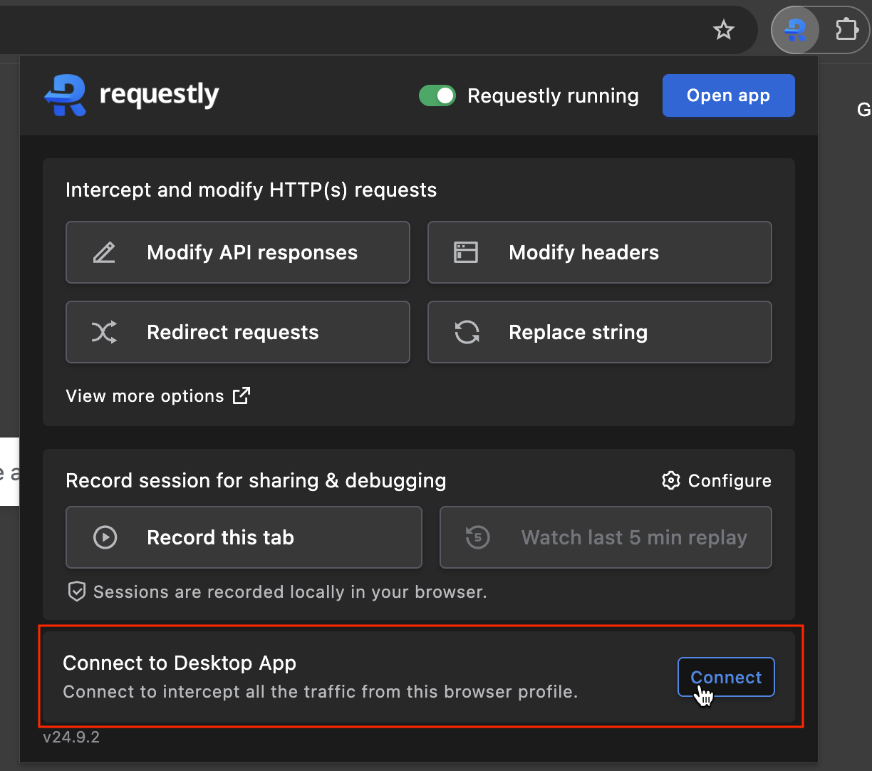 2. Open the Requestly extension popup in the browser profile you want to connect. This button is only visible when the desktop app is open.
