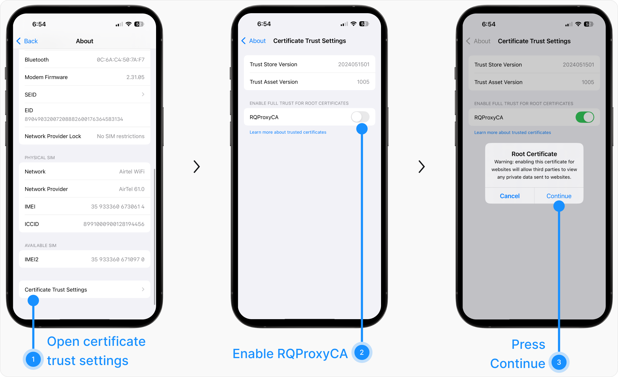 Settings → General → About → Certificate Trust Settings. You should see a certificate under the name RQProxyCA. Enable the trust for Requestly’s certificate authority for intercepting HTTPS traffic.