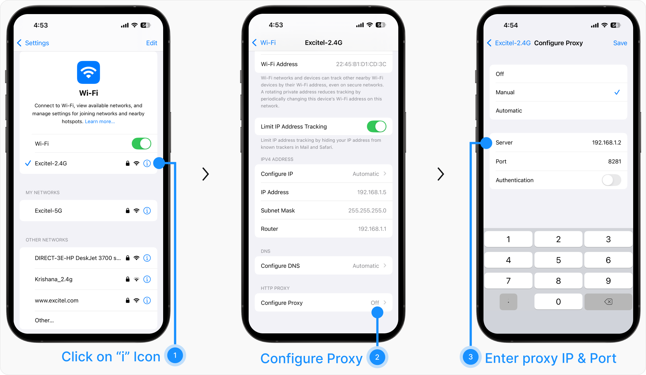 Settings → Wi-Fi → Select current Wi-Fi → Configure Proxy
