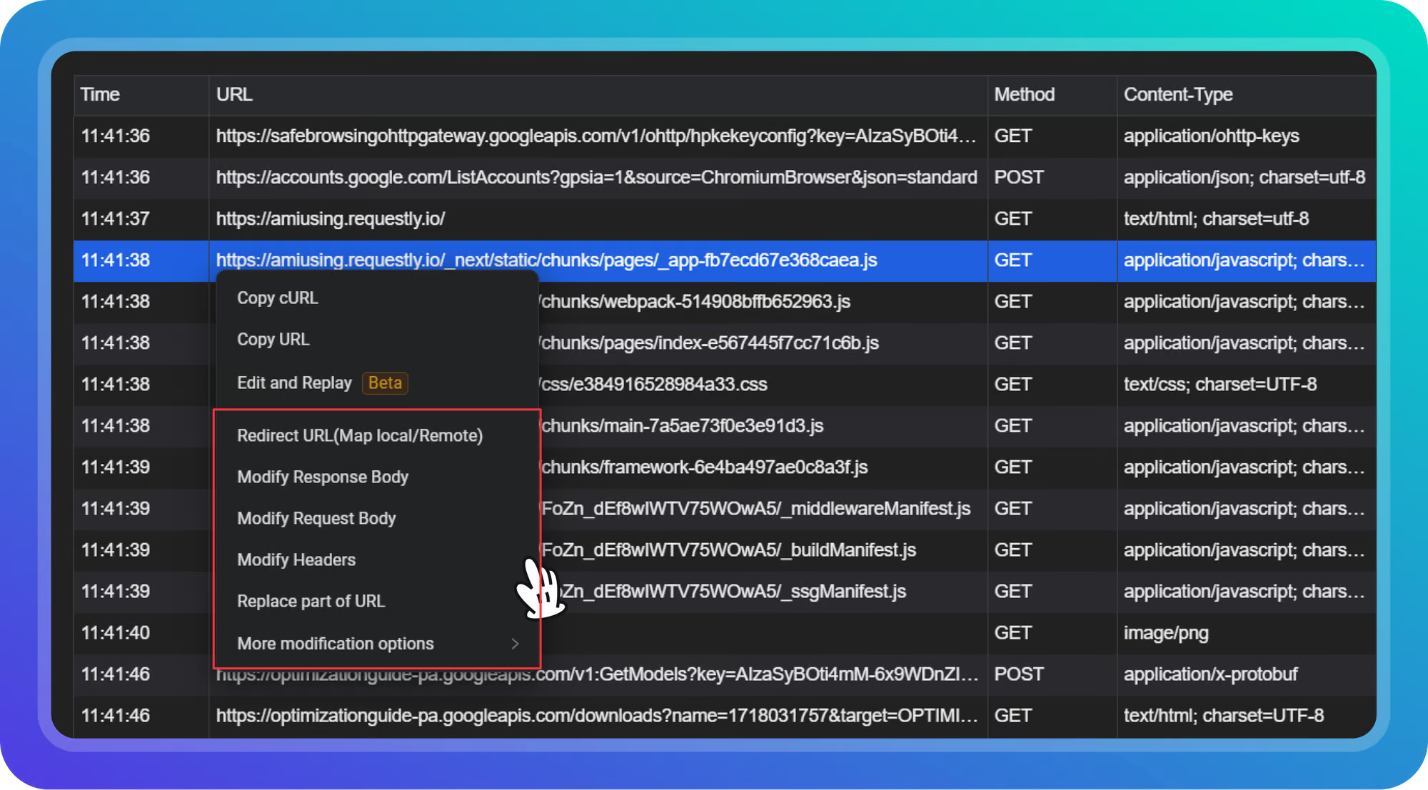 - Request / Response Details - Show detailed headers, payloads, and cookies for selected requests or responses.
