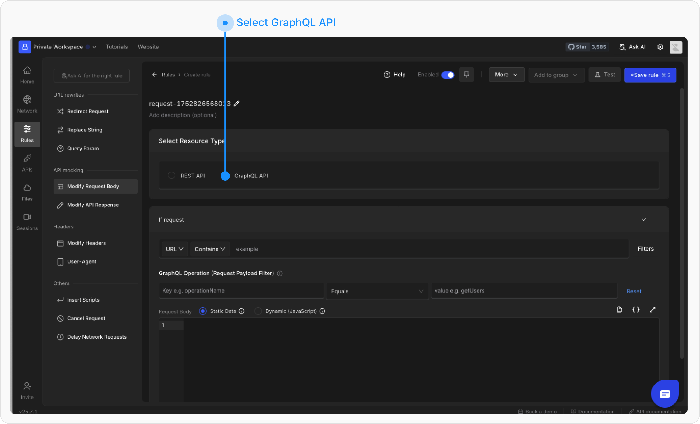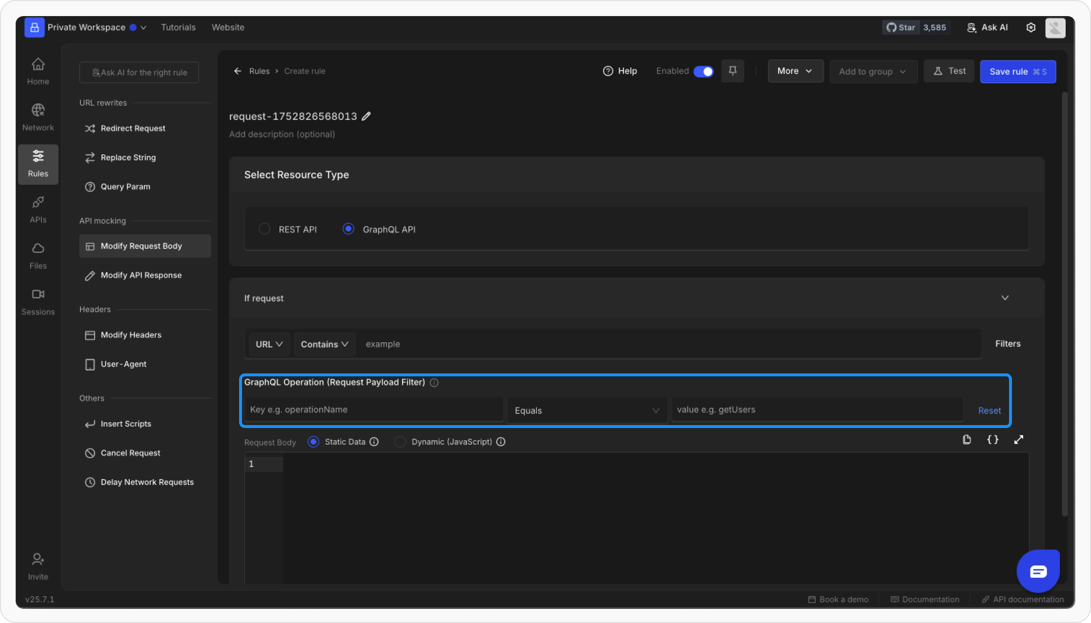 If you need to alter the GraphQL query or its variables, use the Modify Request Body rule to change the request payload dynamically.Steps to Modify Request Body
