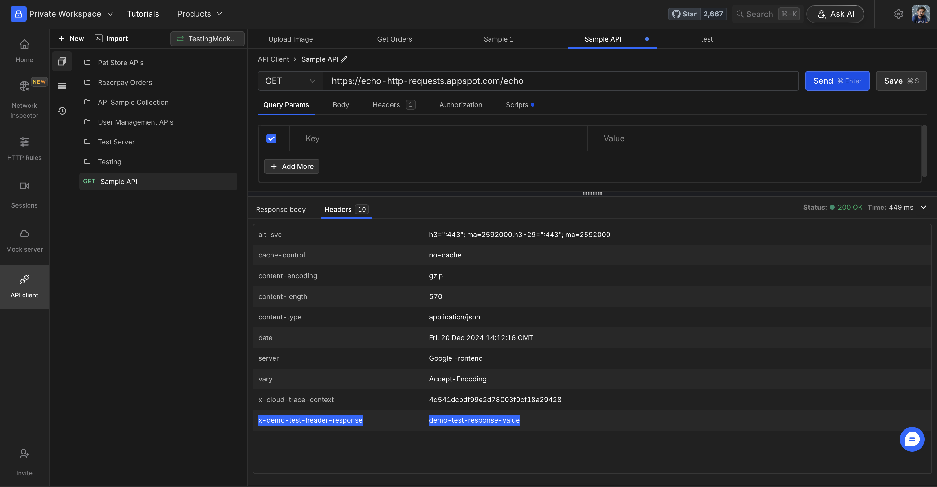 Let’s use an echo endpoint that returns request headers, body, query params etc as JSON response.