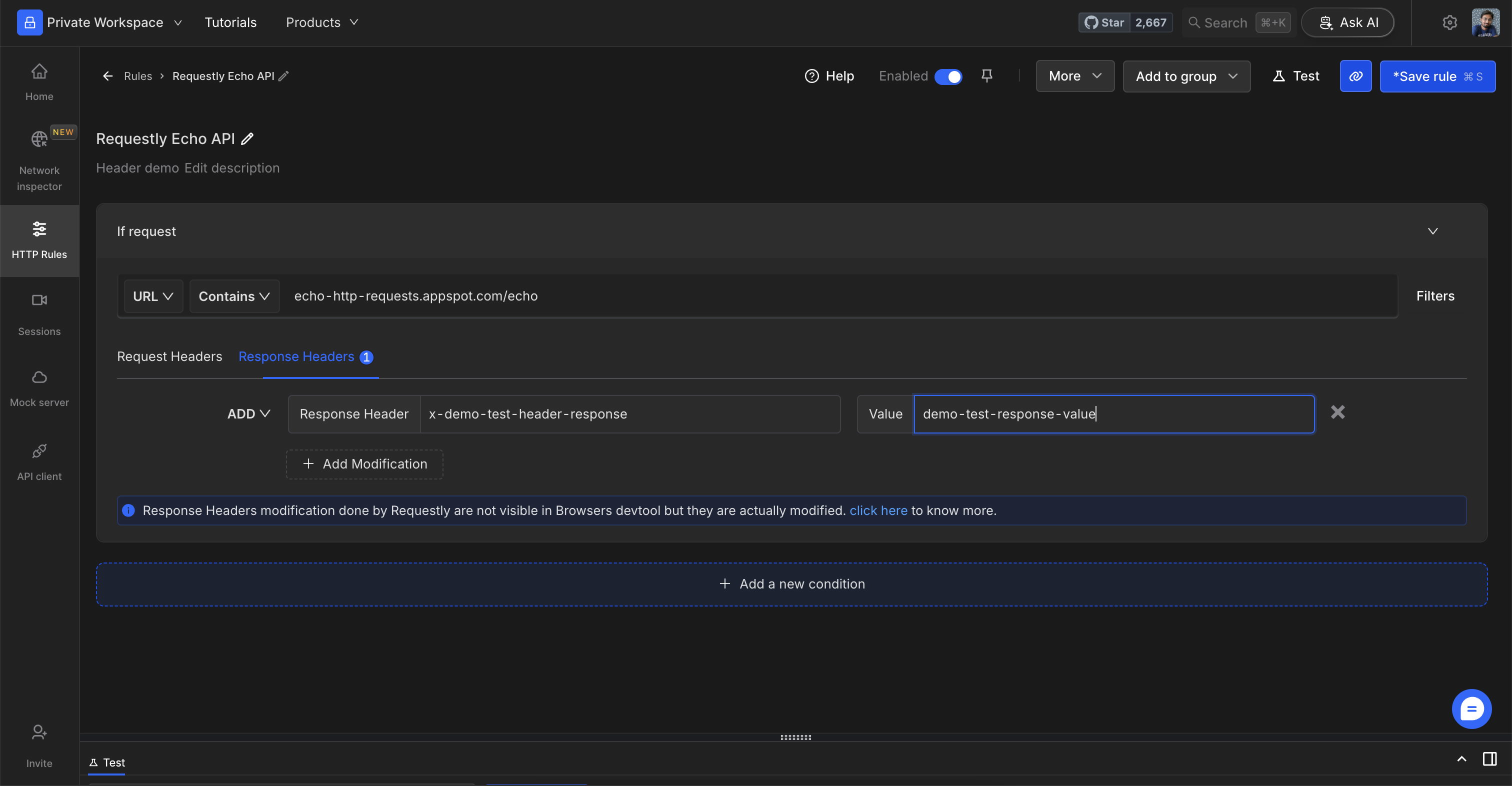 In this step, you can select the option to modify. It rule allows you to edit both the request and the response headers.