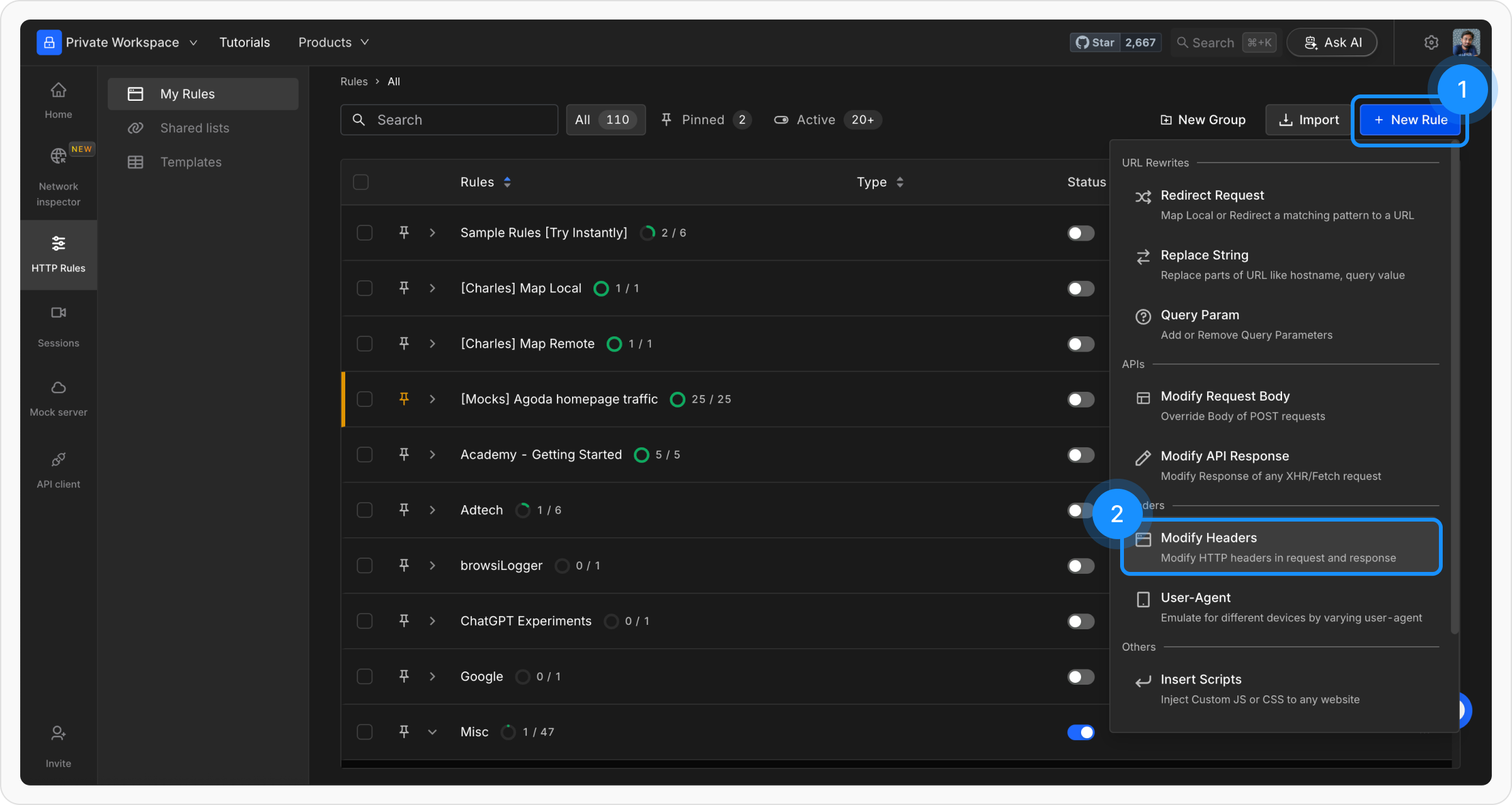 Save to store the rule. After saving, make sure to toggle the rule ON to activate it. This will apply the rule and ensure it works as expected.- Modify Request Headers