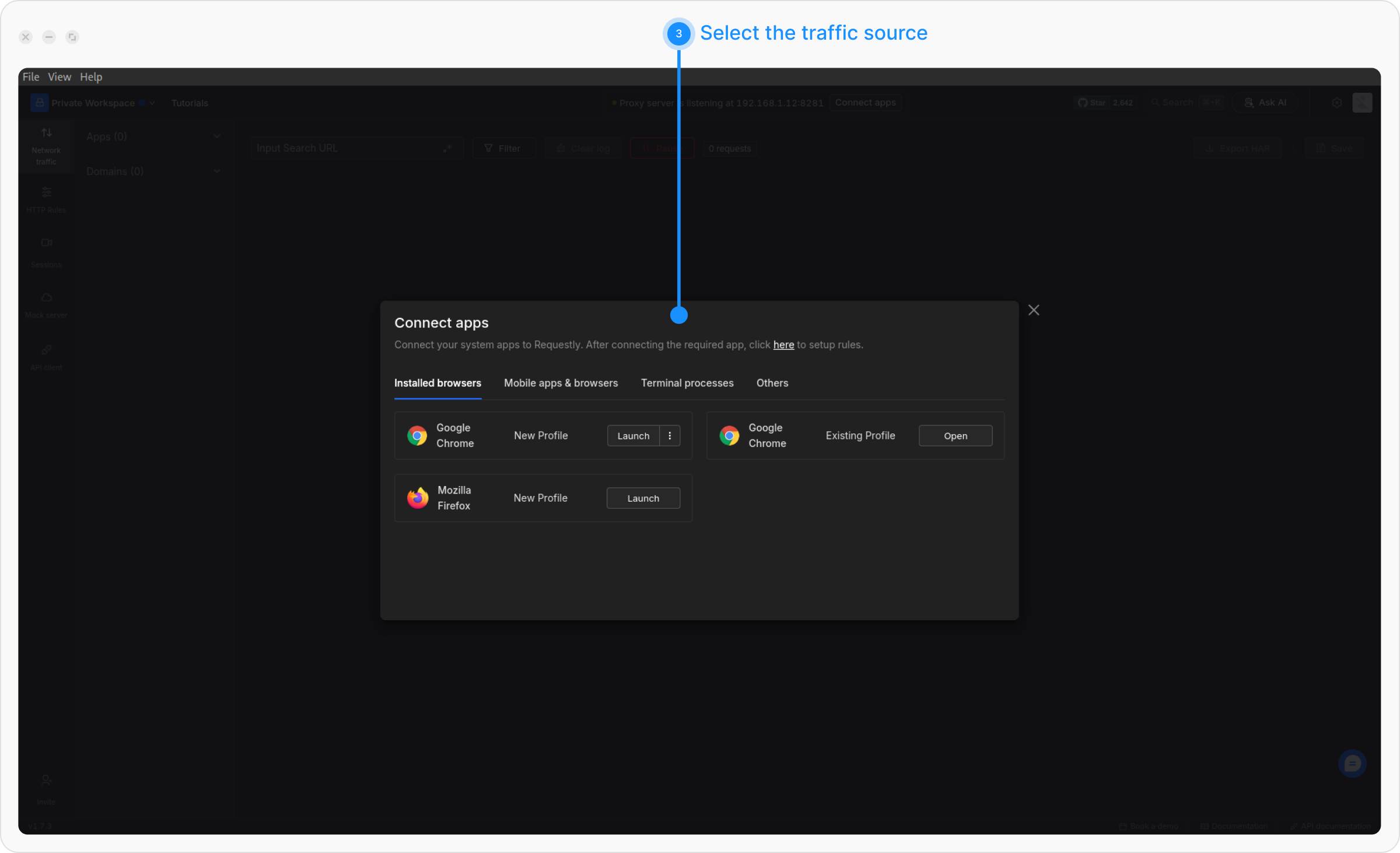 Choose the source from which you want to intercept traffic (e.g., browser, Android, iOS). For browser traffic, click Open/Launch and follow the on-screen instructions. For mobile traffic, follow the specific instructions for connecting Android or iOS.