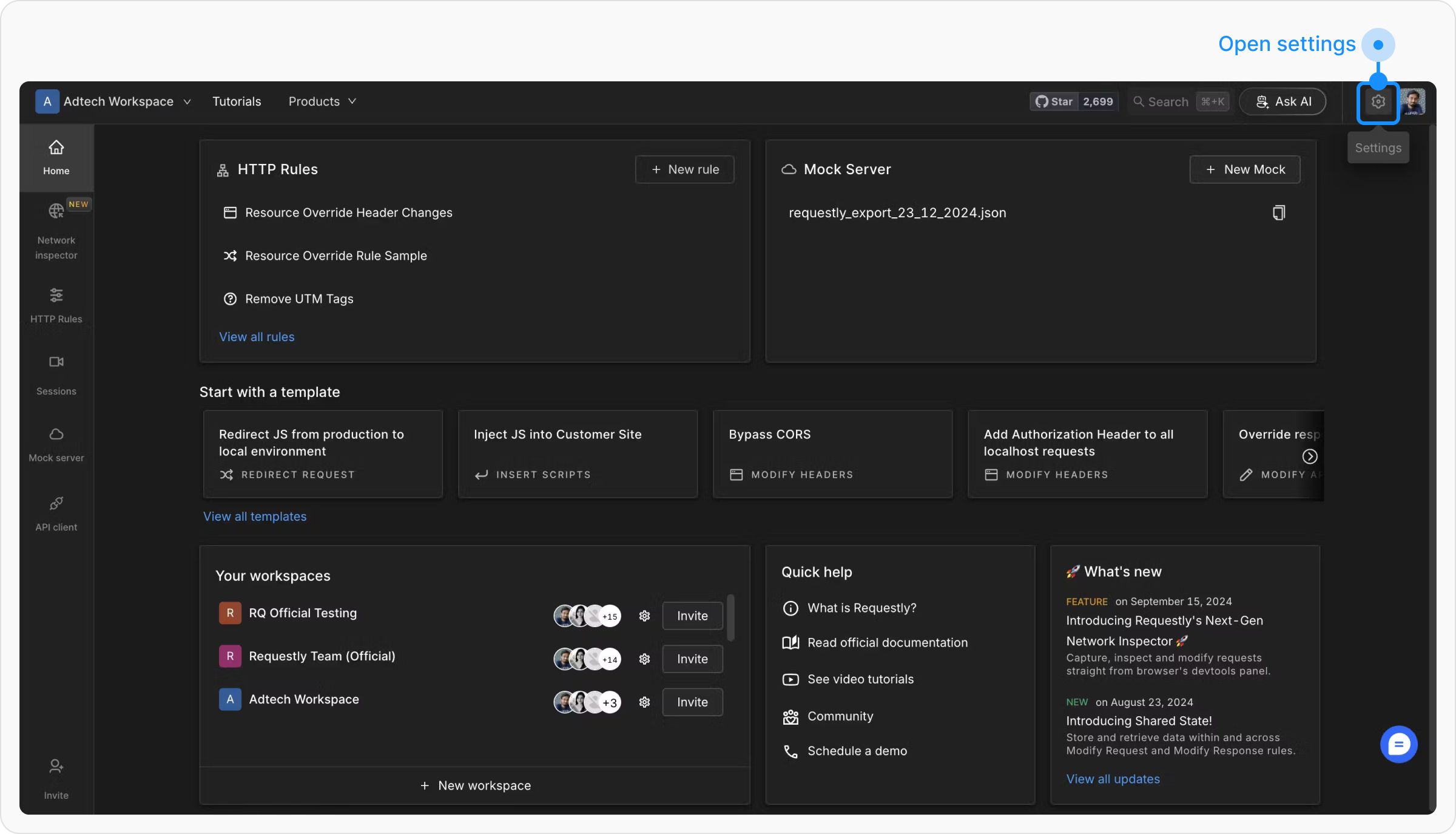 Navigate to the Requestly Settings page, Open the Requestly extension and click on the Settings tab in the left sidebar.